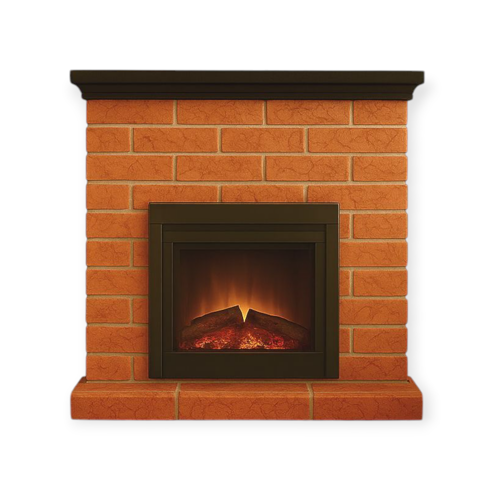 Fireplace. Ochre Brick. Handmade Base. Wood Top. 3D Electric Insert.